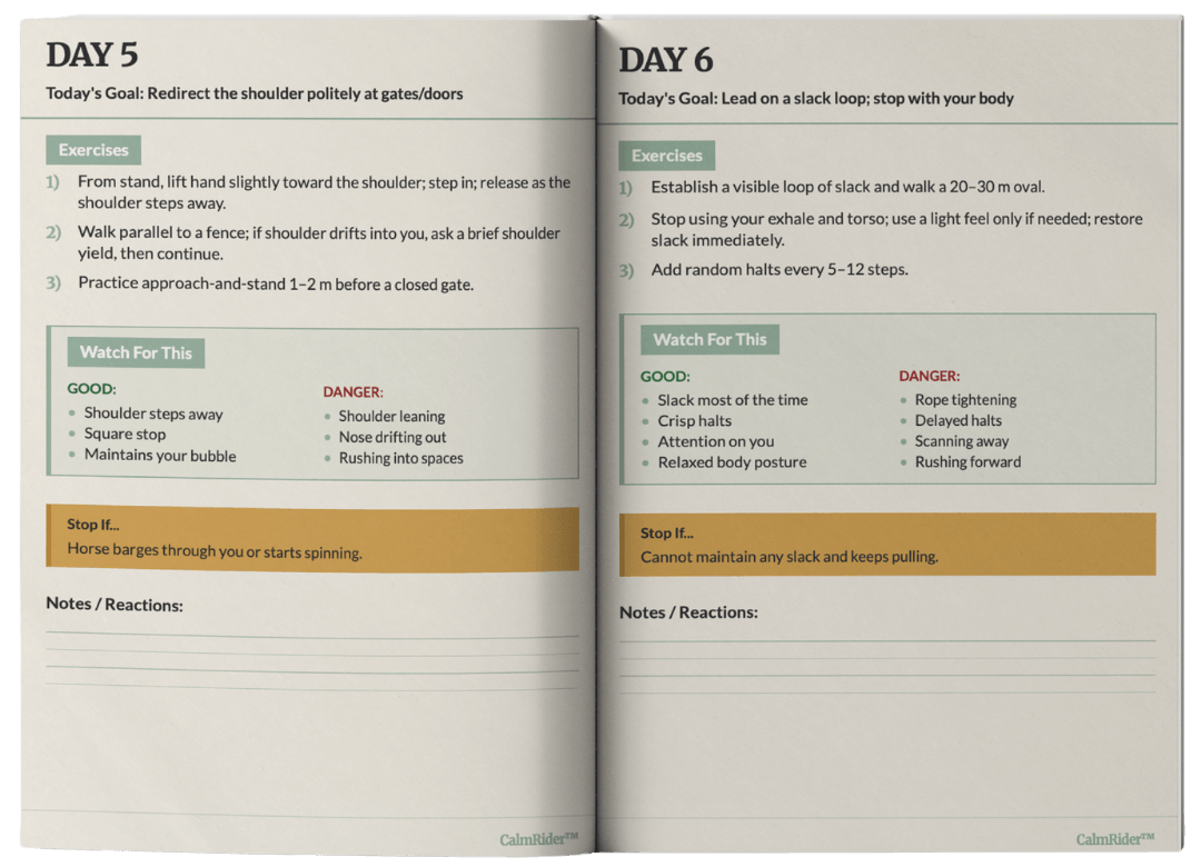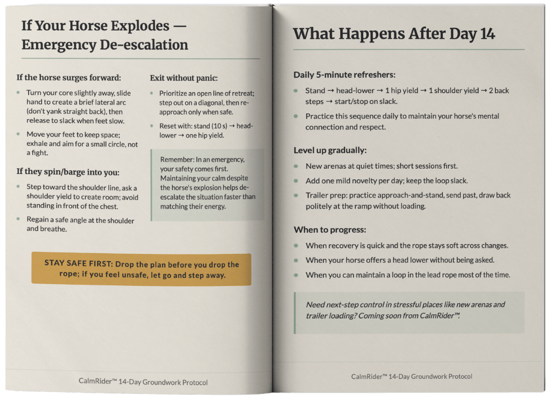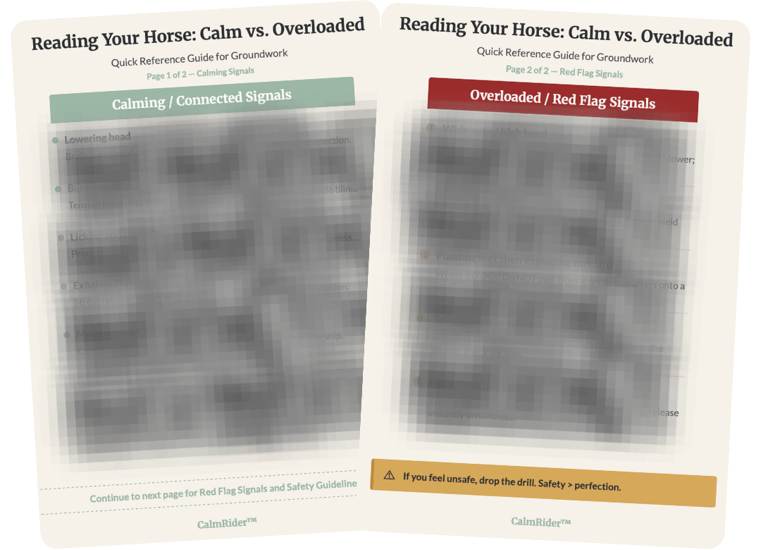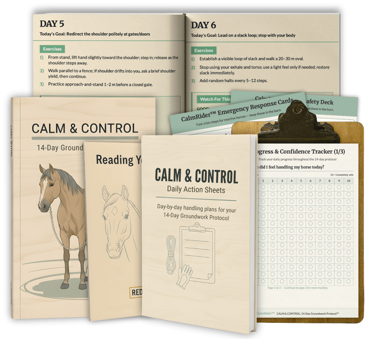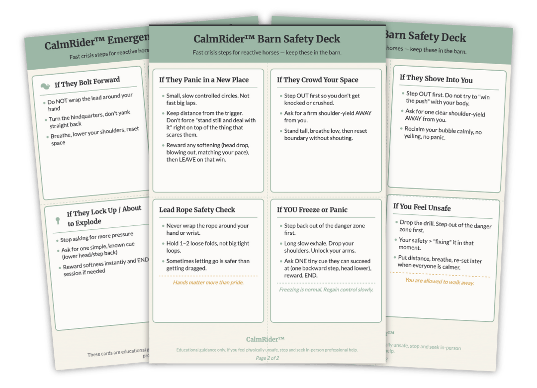 CalmRider™ and CALM & CONTROL™ are educational resources only and are not a substitute for in-person professional training, veterinary advice, or emergency assistance. Working with horses involves risk. Always use your own judgment and stay within your skill level.